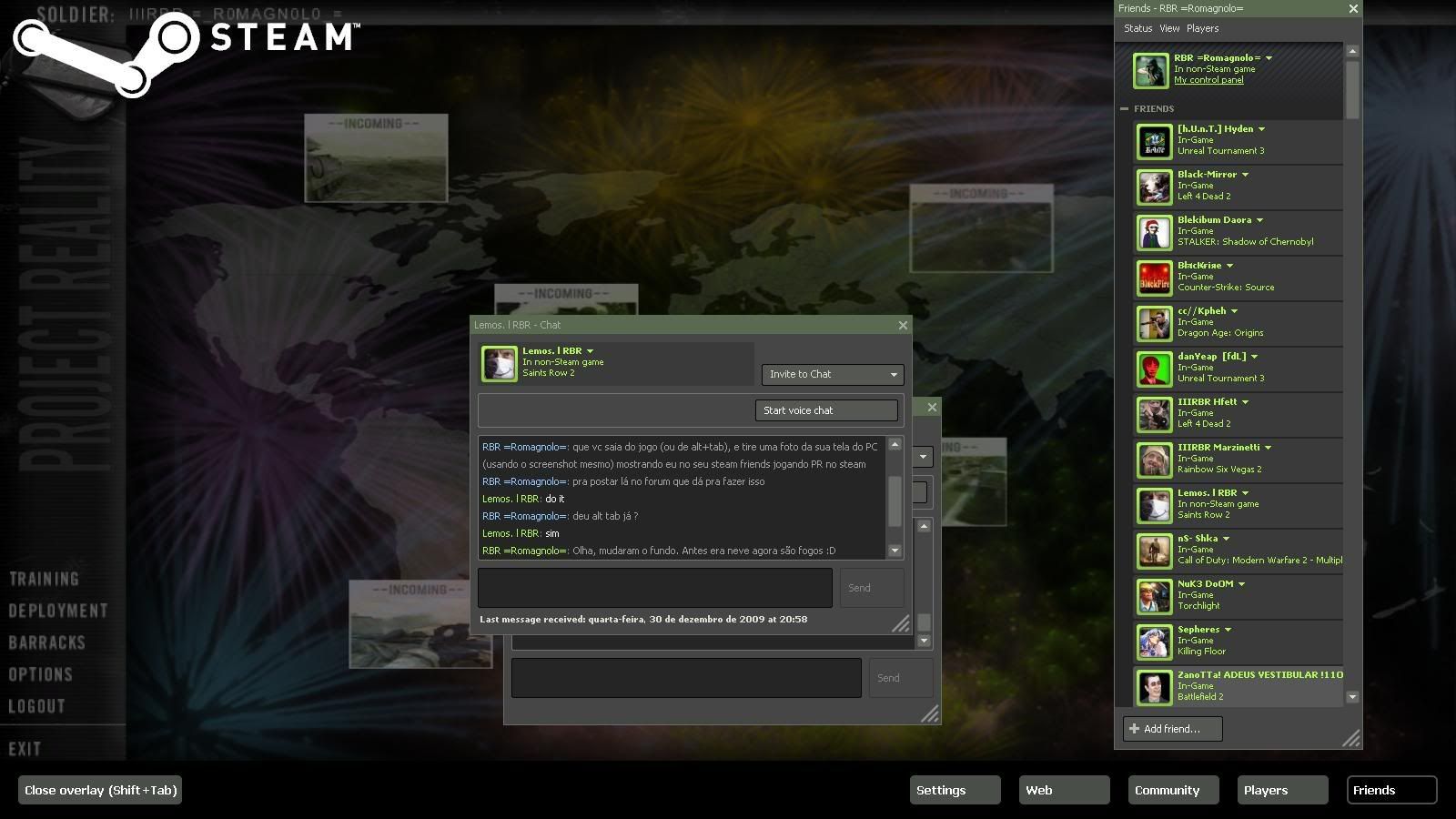 With the last special sale in Steam, many friends bought Battlefield 2 and many of them started playing Project Reality too. That is great, the problem is that they keep using the steam-friends network to keep chating with me, so I have to "alt+tab" the game many times to answear them and return to the game (wich, sometimes, doesnt happen).
